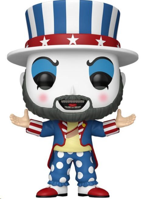 Figura Pop! Vinyl del Capitán Spaulding, personaje icónico de la película de terror La casa de los 1000 cadáveres, con una altura aproximada de 9 cm. Presenta su característico maquillaje de payaso, barba oscura y mejillas sonrojadas, con una amplia sonrisa inquietante.