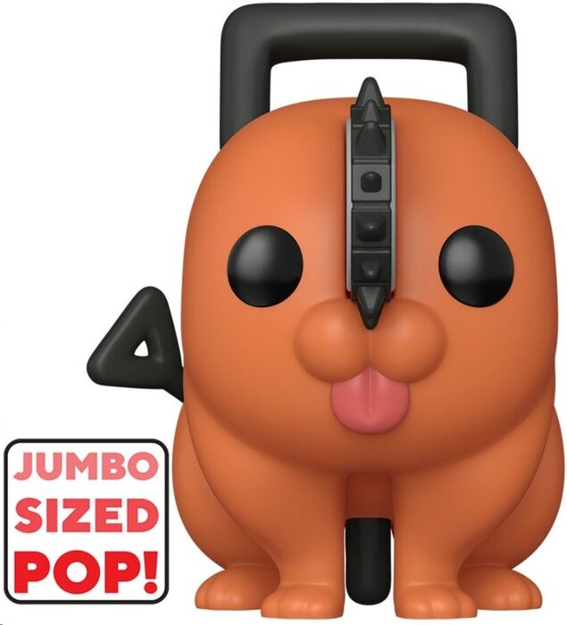 Figura Jumbo Sized Pop! Vinyl de Pochita, el adorable y letal demonio motosierra del manga y anime Chainsaw Man, con un tamaño aproximado de 25 cm. Su diseño captura perfectamente su forma compacta, con cuerpo anaranjado, grandes ojos negros y lengua afuera.