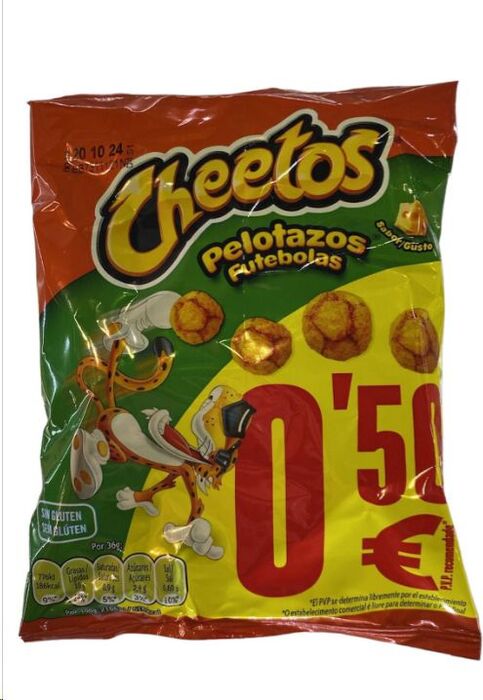 https://comicstores.es/producto/cheetos-pelotazos-36-gr_577728577728CHEETOS PELOTAZOS 36 GRLos Cheetos Pelotazos son un tipo de snack muy popular que consiste en bocaditos de maíz inflado con forma de pequeñas pelotas. Cada bolsa tiene un peso aproximado de 36 gramos, lo que proporciona una cantidad satisfactoria para disfrutar solo o compartir en pequeñas reuniones. Estos snacks son conocidos por su textura crujiente y su sabor intenso a queso, característico de la marca Cheetos.