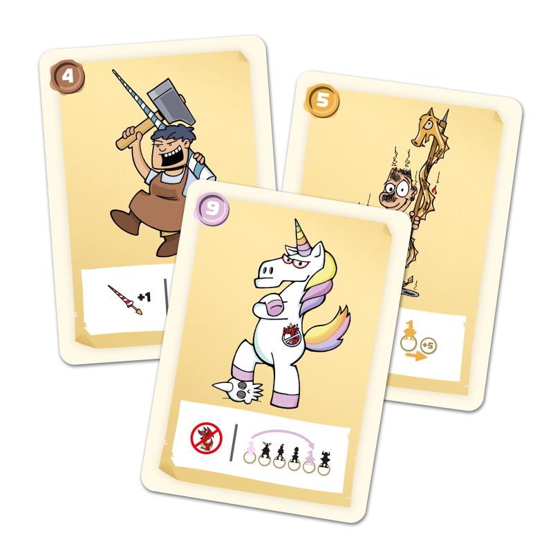 Componentes -9 Cartas de aliado -18 Fichas de trébol -1 Dragón -8 Caballeros -8 Cartas de ayuda -1 Dado de aldea -12 Fichas de lanza -1 Sello de lacre de jugador inicial -2 Tableros de misión -1 Tablero -1 Reglamento