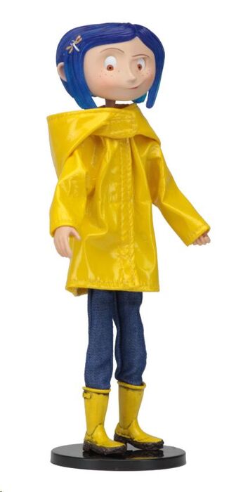 Uno de los estrenos de animación más importantes de 2009 fue el de la película de animación "Coraline", adaptación cinematográfica de la obra de Neil Gaiman que fue dirigida, ni más ni menos, que por Henry Selick. Neca se enorgullece de presentarnos esta serie de "Bendy Fashion Dolls", muñecas con ropa de tela de 18 cm. de un gusto exquisito. La figura articulada cuenta con unos ojos que se mueven, lleva un chubasquero y botas de agua como se ve en la película y viene con una base para exposición.