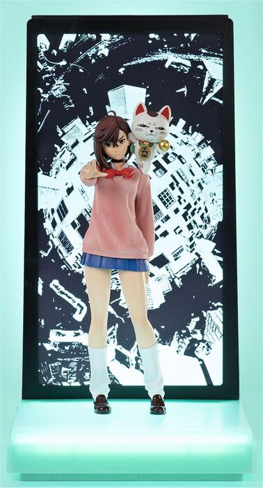 La escena se completa con un fondo iluminado que recrea un entorno urbano estilizado directamente inspirado en el anime. El sistema LED potencia la composición y aporta un efecto visual muy llamativo, envolviendo la figura en una atmósfera dinámica que resalta cada detalle y convierte la pieza en un punto focal dentro de cualquier colección.