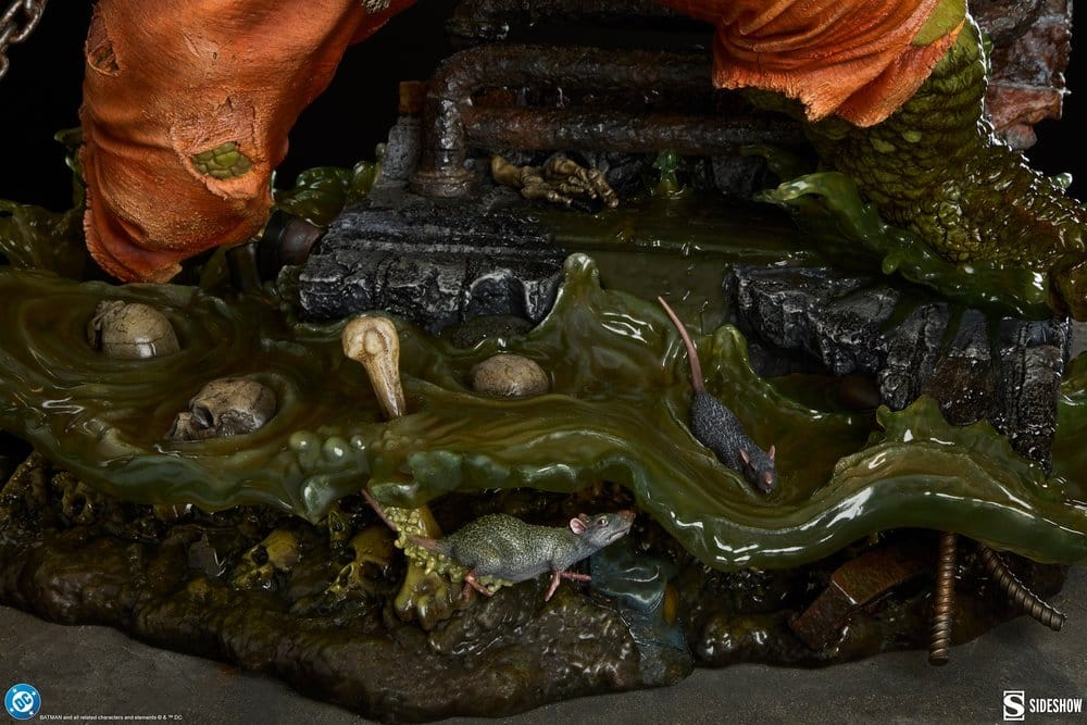Inspirada en su apariencia en los cómics, la estatua muestra a Waylon Jones emergiendo desde las alcantarillas de Gotham con un rugido salvaje. Su piel reptiliana, su poderosa musculatura y su expresión desatada transmiten toda su naturaleza indomable. La escena cobra vida con una base altamente detallada que recrea su entorno, incluyendo agua verdosa en movimiento, restos óseos y referencias ocultas a su historia, como la máscara de Bane o guiños a momentos clave del personaje.