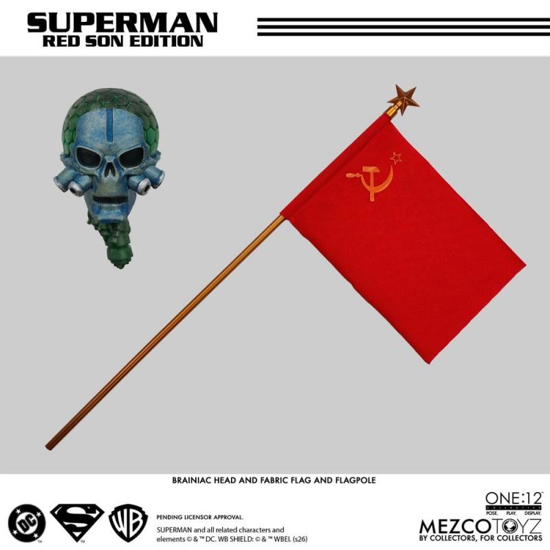 El conjunto se completa con accesorios como una cabeza de Brainiac, una bandera de tela con asta, base de exposición con emblema y soporte ajustable One:12 Collective. Una pieza pensada para quienes buscan figuras de alta calidad con gran nivel de detalle y opciones de personalización.
