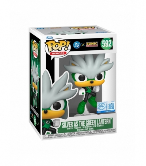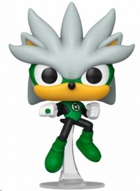 Esta figura Pop! de 9 cm presenta a Silver, el erizo plateado del universo Sonic, fusionado con la imagen del Green Lantern. Viste el característico traje verde y negro con el emblema de la corporación en el pecho y el anillo de poder en su mano derecha.