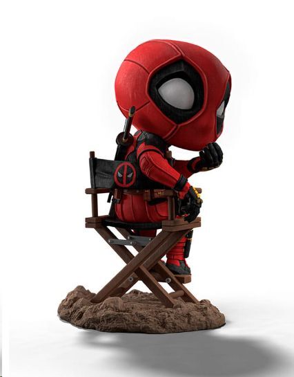 La figura muestra a Deadpool en una pose relajada y característica de su personalidad irreverente. Está sentado en una silla de director, con su icónico traje rojo y negro. Lleva sus espadas katana en la espalda y sujeta una paleta en una mano, mostrando su actitud desenfadada y humorística. La base imita una superficie terrosa, añadiendo un toque de ambiente a la figura.
