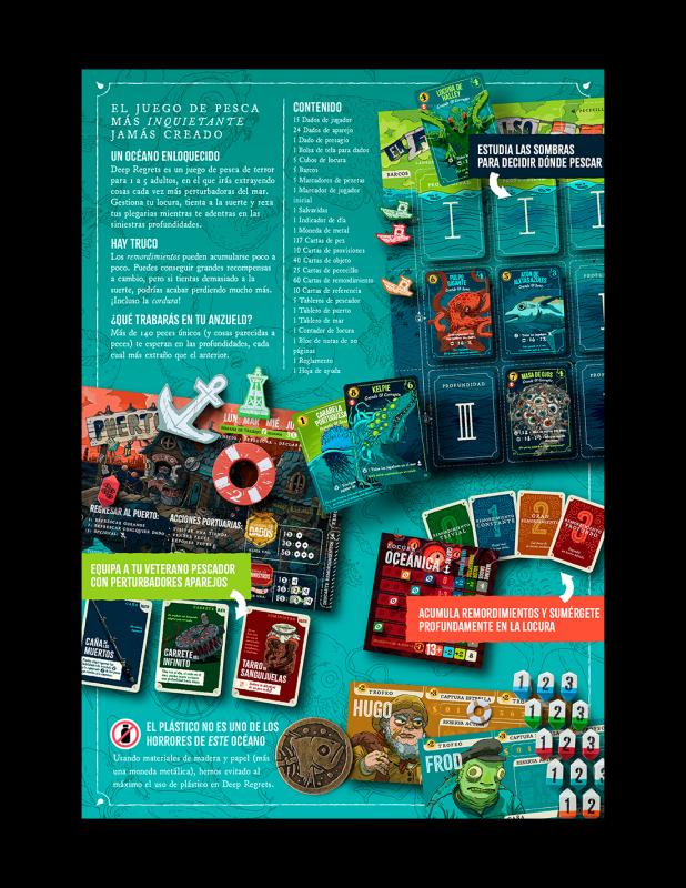 https://comicstores.es/producto/deep-regrets_599714599714DEEP REGRETSDeep Regrets es un juego de pesca de terror en el que tendrás que extraer del océano criaturas cada vez más aterradoras. Decide qué comer, qué vender, qué exponer y con cuántos arrepentimientos estás dispuesto a cargar mientras te exiges demasiado y te precipitas hacia el final en este juego estratégico de pesca de terror. Tirarás dados personalizados de aparejo al comienzo de cada turno para determinar tu fuerza y luego decidir si te quedarás en el mar o volverás a puerto para vender pescado, comprar provisiones y recargar energías.
