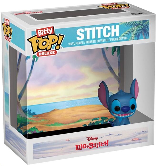 ¡Amplía tu colección de Disney con esta encantadora figura Deluxe Bitty POP! de Stitch en la playa! Este pack incluye a Stitch en un diseño miniatura de 2.2 cm de altura, encapsulado en una elegante caja de acrílico que realza el tema playero. La figura de vinilo se encuentra sobre una base de acrílico que se puede retirar fácilmente, permitiendo que el pequeño Stitch se destaque aún más contra el fondo de playa que completa la escena.
