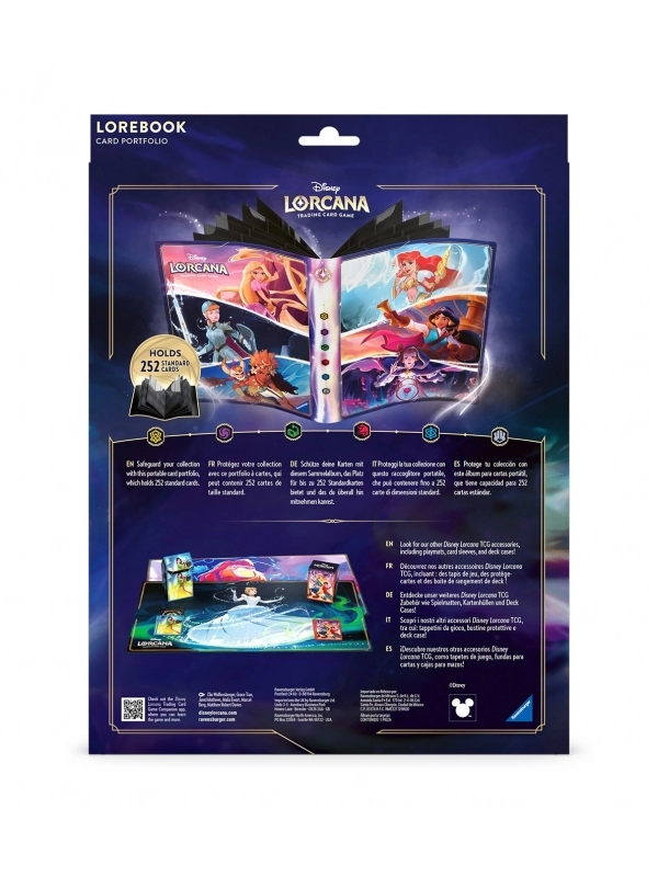 Tiene capacidad para almacenar hasta 252 cartas de tamaño estándar, distribuidas en páginas con bolsillos de carga lateral que ayudan a mantener tu colección segura, ordenada y lista para cualquier reto. Ideal para jugadoras, coleccionistas y fans del universo Lorcana que buscan un toque mágico y elegante para su set.