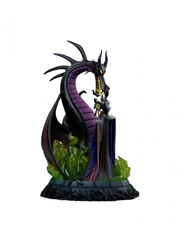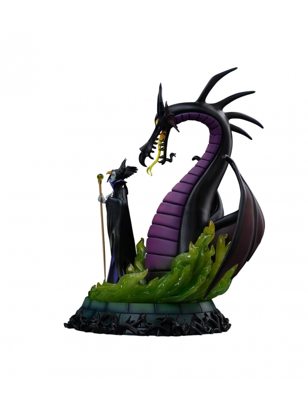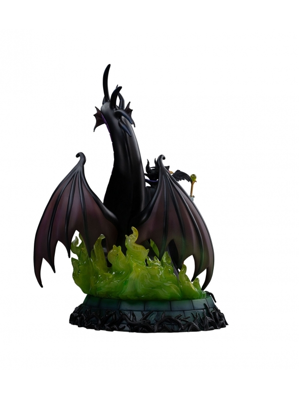 La escultura muestra a Maléfica envuelta en su capa negra con matices púrpura, sosteniendo su bastón mientras invoca llamas verdes que rodean la base. Tras ella se alza el majestuoso dragón con alas desplegadas y mirada desafiante, creando una composición llena de dramatismo y movimiento. Los detalles en el rostro, las texturas del vestuario y los efectos translúcidos aportan profundidad y realismo a la escena.