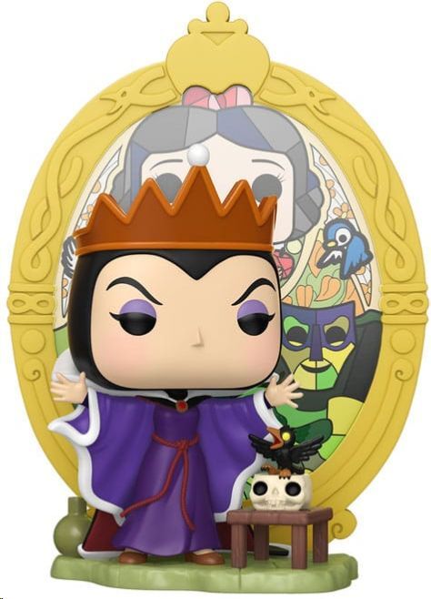 La escena incluye un fondo detallado con un gran espejo decorativo en tonos dorados, que enmarca ilustraciones de Blancanieves, el propio espejo mágico y otros elementos de la historia. A su lado, sobre una mesa, descansa una calavera junto a un cuervo, reforzando la atmósfera oscura y siniestra.