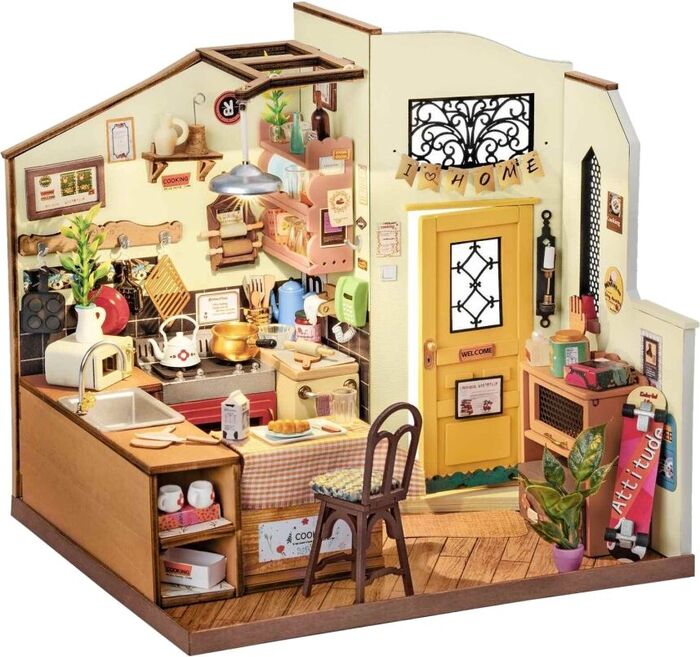 https://comicstores.es/producto/diy-miniature-house-betty-s-kitchen_589589589589DIY MINIATURE HOUSE BETTY´S KITCHENDale vida a la cocina más acogedora con Bettys Kitchen, la casa en miniatura DIY de Rolife que captura el alma de un hogar lleno de calidez, aromas deliciosos y detalles encantadores. Con 196 piezas y un montaje accesible gracias a su guía ilustrada, este kit recrea una cocina al más puro estilo retro, con muebles, utensilios, ingredientes y hasta un patinete aparcado junto a la puerta.