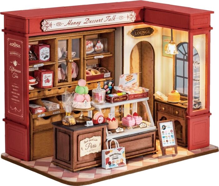 ¡Dale forma a tu rincón más dulce con Honey Dessert Talk de Rolife! Este kit DIY de 242 piezas te invita a construir una adorable pastelería de estilo parisino, llena de detalles minuciosos: vitrinas repletas de macarons, galletas, donuts y pasteles que puedes montar y colocar a tu gusto.