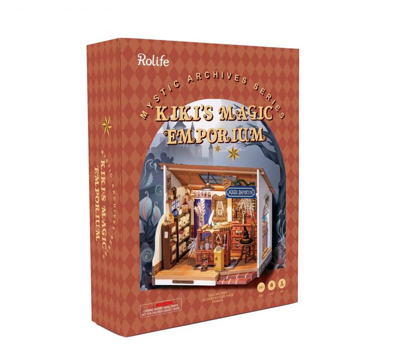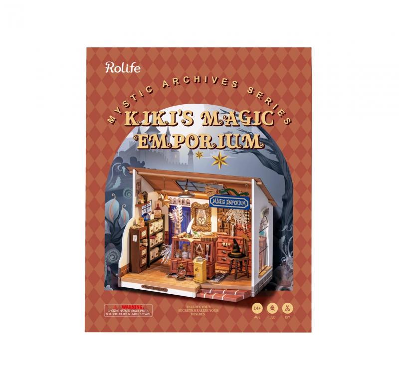¡Descubre los secretos de la magia con Kikis Magic Emporium de Rolife! Este encantador kit DIY te propone construir una misteriosa tienda mágica llena de detalles: frascos con ingredientes secretos, estantes con pociones, varitas, un sombrero de bruja y hasta una escoba voladora colgando del techo.