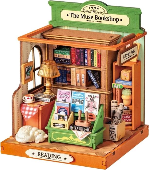 Haz realidad tu rincón lector soñado con The Muse Bookshop de Rolife, una librería en miniatura que captura todo el encanto de los pequeños refugios literarios. Este kit DIY de 68 piezas incluye estanterías repletas de libros, una lámpara de escritorio, una taza de café, muebles vintage y hasta un gato dormilón que cuida el ambiente.