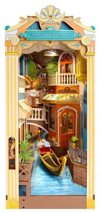Monta tu rincón veneciano sin pegamento y con una precisión que ni un reloj suizo. Todo protegido por una lámina anti-polvo para que tu góndola no acabe como el Halcón Milenario en Tatooine. Si amas los viajes, las maquetas o simplemente quieres un portal a la Serenísima entre tus novelas, este book nook es tu billete directo