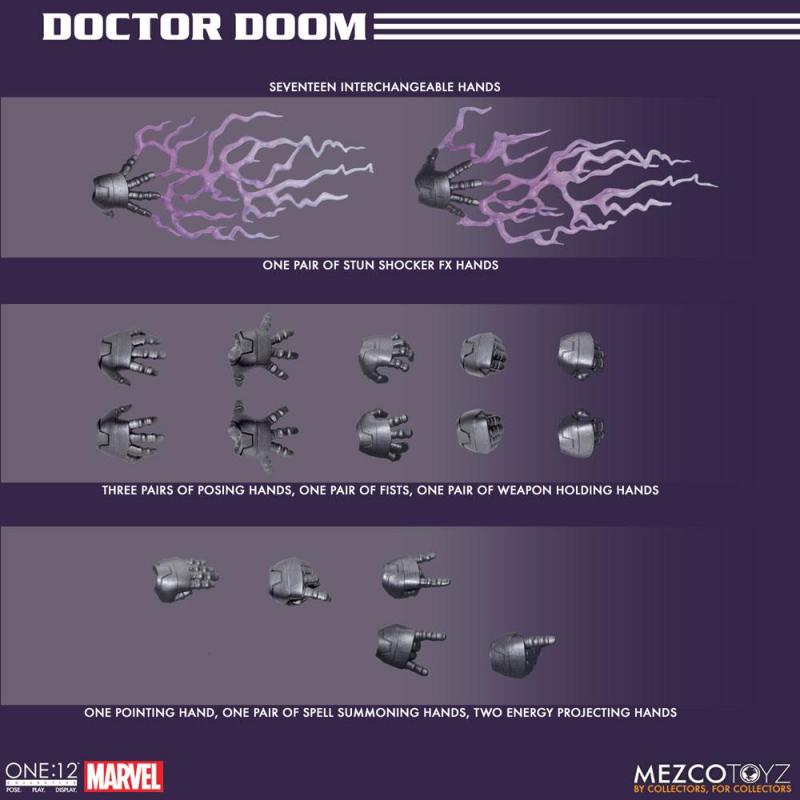 Doctor Doom maneja el arnés de sifón de poder cósmico que cuenta con una función de iluminación. El arnés se conecta de forma segura a su traje blindado y le permite drenar la energía cósmica de seres con gran poder. El maestro de la ciencia y la hechicería viene completo con su arma de electrochoque característica que cabe perfectamente en la funda de su cinturón, un libro de hechizos con bisagras con páginas impresas, propulsores de cohetes intercambiables que se adhieren a la parte posterior de su traje blindado y mucho más.