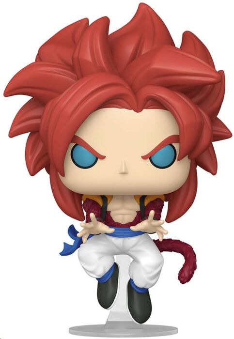Esta figura Pop! representa a Gogeta en su poderosa transformación Super Saiyan 4, directamente desde Dragon Ball GT. Con su melena roja alborotada y expresión desafiante, la figura transmite toda la energía y arrogancia característica de esta fusión legendaria. La piel clara, los ojos azul celeste y la cola peluda completan el aspecto salvaje que define esta versión del personaje.