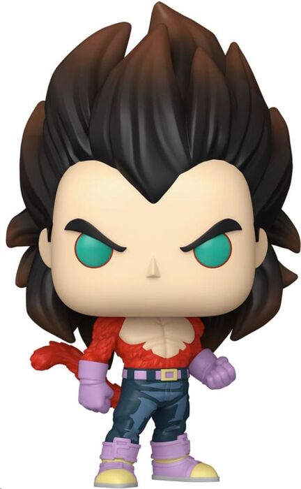 Esta figura Pop! de Vegeta en su transformación Super Saiyan 4 es una representación imponente del príncipe saiyan en su versión más salvaje de Dragon Ball GT. Su melena negra, erizada y voluminosa, domina visualmente el conjunto, mientras que su mirada penetrante con ojos verde esmeralda refleja su intensidad y orgullo característicos. La expresión seria y desafiante no deja lugar a dudas sobre su determinación en combate.