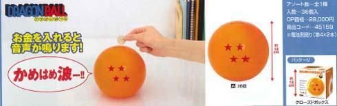 Hucha en forma de bola de dragón, que tiene la gracia añadida de que emite sonido cuando se le echan monedas. Tiene una altura de unos 13cm.