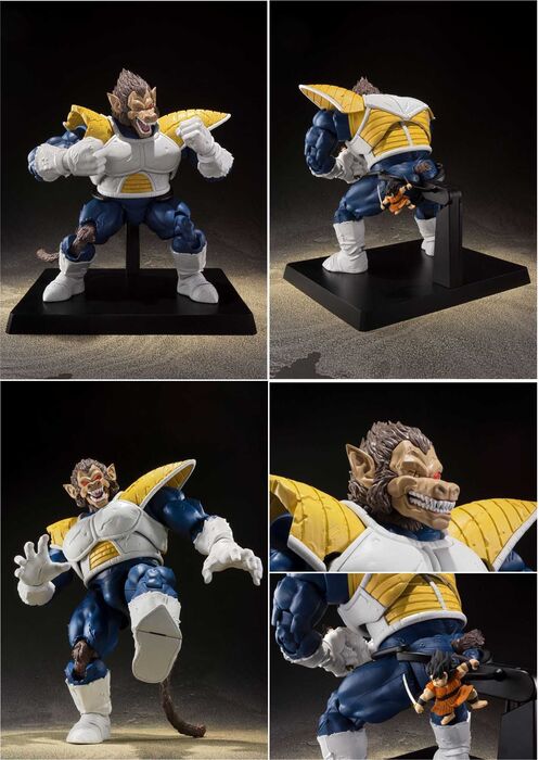 Tamashii Nations presenta la nueva versión de Vegeta en su forma colosal Great Ape para la colección SH Figuarts. Se trata de una exclusiva de la web de Tamashii. Es una figura articulada hecha en PVC y mide unos 35 cm de alto. Figura articulada de la línea "S.H. Figuarts", tamaño aprox. 35 cm. Viene con base soporte para exposición. Además incluye 1x mano izquierda opcional, 2x mano derecha opcional, 1x par de manos juntas opcional, 1x ojos opcionales, 2x colas (larga y cortada) y una mini figura de Yajirobe.