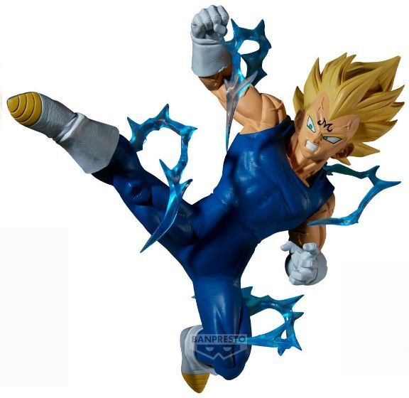 Esta pieza dinámica captura al príncipe saiyajin en su forma Majin, destacando la emblemática "M" en su frente que representa su poder amplificado por la influencia de Babidi.