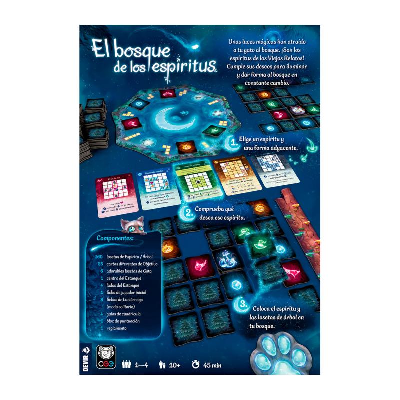 Diseñado por Reed Ambrose, El bosque de los espíritus se puede disfrutar en solitario o en grupos de hasta 4 jugadores, a partir de 10 años, en sesiones de entre 30 y 45 minutos. Los jugadores competirán a lo largo de tres rondas para crear el bosque más armonioso. Al final, quien consiga más puntos, tanto por las cartas de objetivo como por haber completado su cuadrícula, ganará la partida.