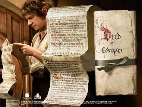 Réplica a tamaño real del contrato de saqueador de Bilbo Bolsón. Mide aproximadamente 28 x 165 cm una vez abierto. Basada en la saga de "El Hobbit".