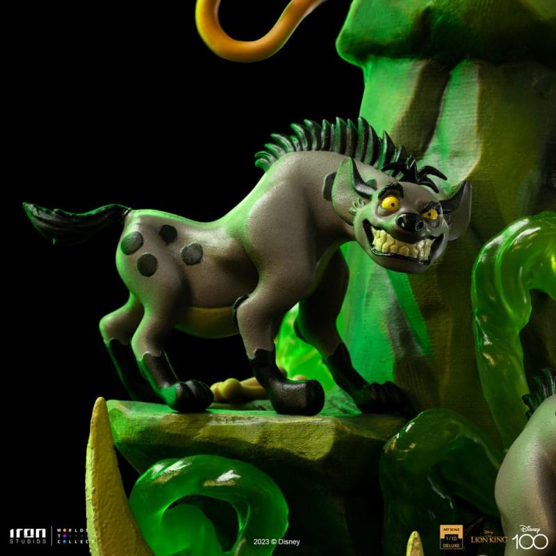 La estatua no solo destaca por su increíble realismo y precisión en los detalles, sino también por su tamaño práctico que la hace perfecta para exhibirse en cualquier colección de memorabilia de Disney o de "El Rey León". Esta edición deluxe es un must para los coleccionistas que buscan capturar la intensidad y la complejidad del villano más célebre de la sabana.
