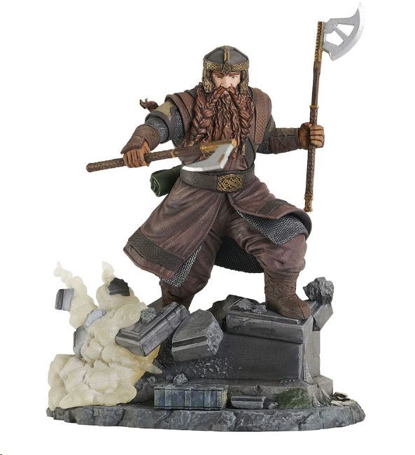 Esta estatua de PVC pertenece a la línea "Gallery" de "El Señor de los Anillos" y representa a Gimli, el valiente enano guerrero de la trilogía. Mide aproximadamente 20 cm de altura y está meticulosamente detallada, mostrando a Gimli en una pose dinámica de batalla con su hacha y escudo, sobre una base que emula un escenario de combate con escombros y piedras.