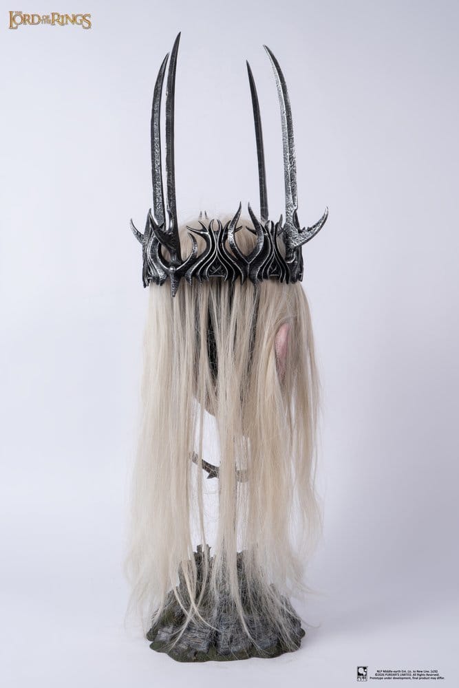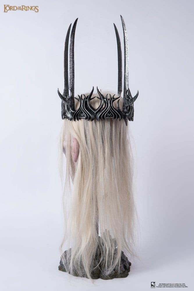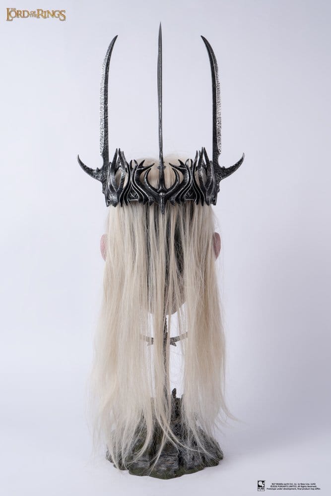 Fabricada por Pure Arts, esta pieza destaca por su nivel de detalle en cada acabado, desde la expresión espectral del rostro hasta la imponente corona y la cuidada recreación del cabello. La base decorativa refuerza su carácter expositivo, creando una escena que evoca la oscuridad y el poder del temido líder de los Nazgûl.