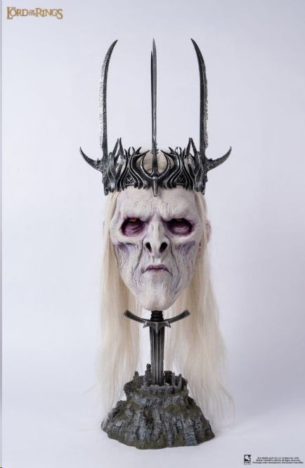 Impresiona con una pieza única del universo de El Señor de los Anillos gracias a esta réplica a escala 1:1 del Rey Brujo de Angmar. Con una altura aproximada de 73 cm, esta máscara artística captura con gran realismo la presencia aterradora de uno de los personajes más icónicos de la saga, convirtiéndose en un elemento central para cualquier colección.