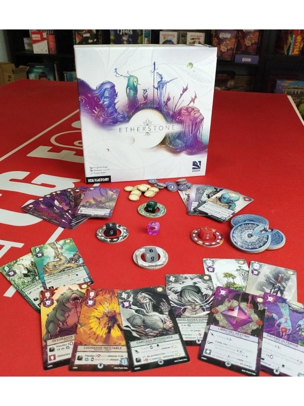 https://comicstores.es/producto/etherstone-castellano_596615596615ETHERSTONE (CASTELLANO)Etherstone, un título de draft de cartas y dados. TCG Factory trae en español este nuevo juego de Thundergryph. Antes de empezar tendrás que crear tu mazo de 7 cartas y elegir tu líder. Podrás escoger entre tres tipos de cartas: seguidores, rituales y tecnología, que te ayudarán a atacar las amenazas, a realizar poderosos hechizos o a modificar tu estrategia.