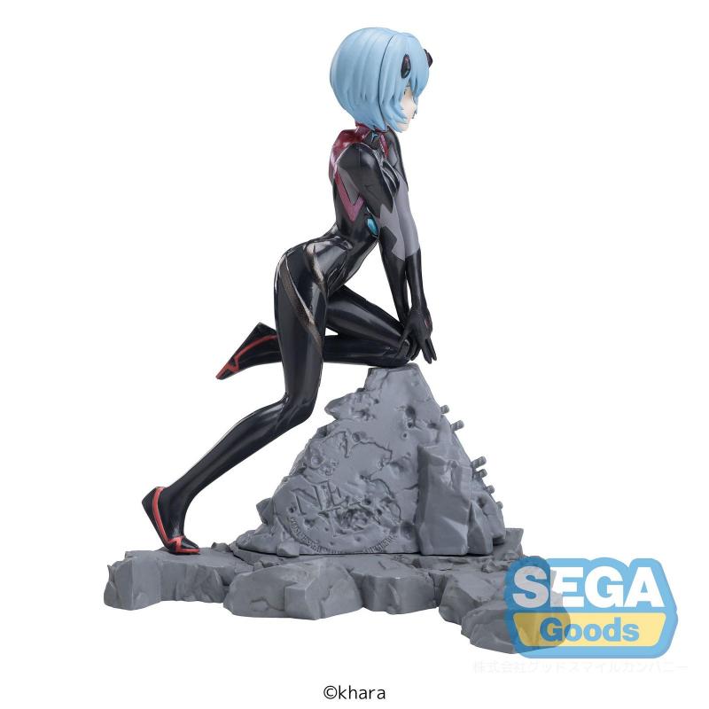 Cada detalle de esta figura ha sido esculpido con precisión, desde el brillo en su traje hasta el delicado trabajo en su cabello azul. La base de la figura simula una superficie rocosa, dándole un toque de dramatismo y resaltando la atmósfera épica que caracteriza a Evangelion. La calidad del acabado en el traje y la pose cuidadosamente elegida hacen que Rei luzca como si estuviera lista para enfrentarse a cualquier desafío.