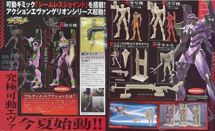Figuras articuladas de unos 10cm de altura de los mech de la serie Evangelion. 5 modelos diferentes que se venden por separado: EVA-01 Test Type, EVA-02 Proto Type, EVA-03 Production Model, Set weapons /Catapult (Shield, Bullet Rifle, Progressive Knife, Positron Rifle (13 cm)), 3rd Angel Sachiel. Las artículaciones son del tipo "seamless joints", que están ocultas y parece más realista.