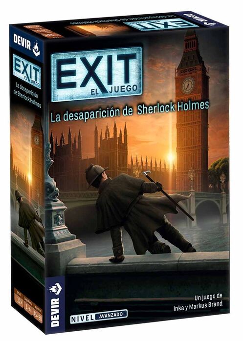 Exit: La desaparición de Sherlock Holmes es un juego de escape cooperativo diseñado por Inka y Markus Brand, que se puede disfrutar en solitario o en un grupo de hasta 4 personas, a partir de 12 años, en partidas que pueden durar entre 60 y 120 minutos. A través de 88 cartas, varios documentos, un descodificador y algunos artefactos especiales, los jugadores podrán explorar e interactuar con el entorno y todo lo que vayan encontrando para tratar de descubrir qué ha pasado con el detective más famoso de todos los tiempos.