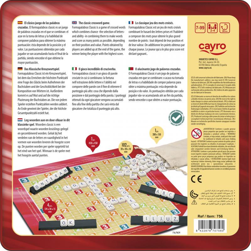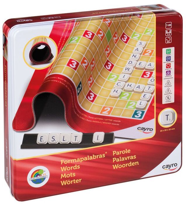 ¡El clásico juego de las palabras cruzadas vuelve con estilo y en formato portátil! Formapalabras de Cayro es ideal para mentes ágiles que disfrutan del reto de combinar letras al azar y formar las mejores palabras posibles. Cuanto más ingeniosa sea tu palabra y mejor la coloques en el tablero, ¡más puntos sumarás! El tapete flexible permite enrollarlo fácilmente y guardarlo todo en su resistente caja metálica. Incluye 102 letras, 4 atriles y un tapete de 43 x 43 cm.