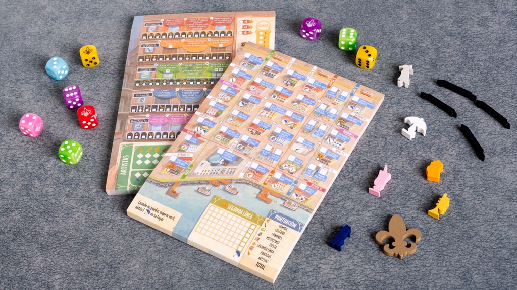 Componentes: 9 dados de Acción, 2 blocs de hojas, 1 marcador de turno inicial, 4 marcadores de Calle Cortada, 4 figuras de Turista, 48 cartas de Acción, 12 cartas de Alcalde,1 reglamento y 1 mini expansión.
