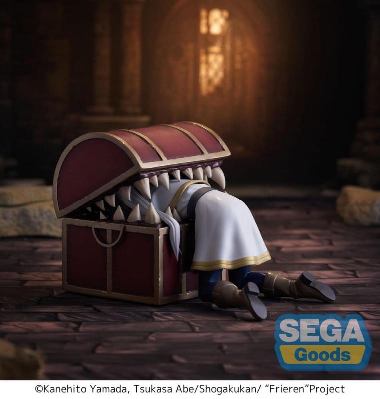 Fabricada en PVC por SEGA, esta figura presenta un conjunto detallado con varios elementos: el cofre mimic (aprox. 9 x 8 cm), la figura de Frieren (aprox. 6 x 13 cm) y la lengua del cofre (aprox. 6 x 6 cm). El esculpido y los acabados resaltan tanto la escena como los pequeños detalles, creando una pieza dinámica y llamativa.