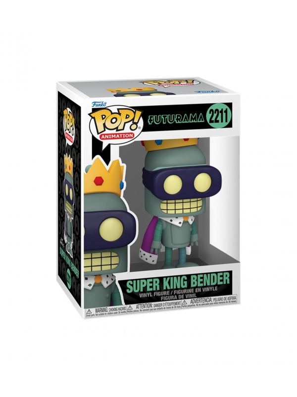 Figura de vinilo de la línea POP! que representa a Super King Bender, una versión alternativa y exagerada del carismático robot del universo de Futurama. El diseño destaca por su corona, la capa real y una expresión inconfundible que encaja perfectamente con el humor satírico de la serie.