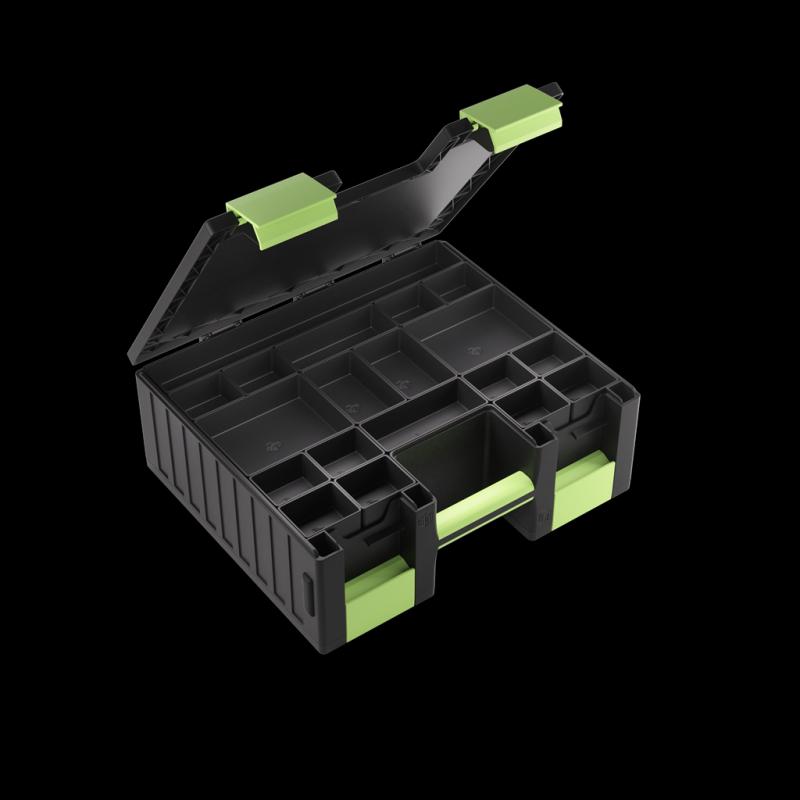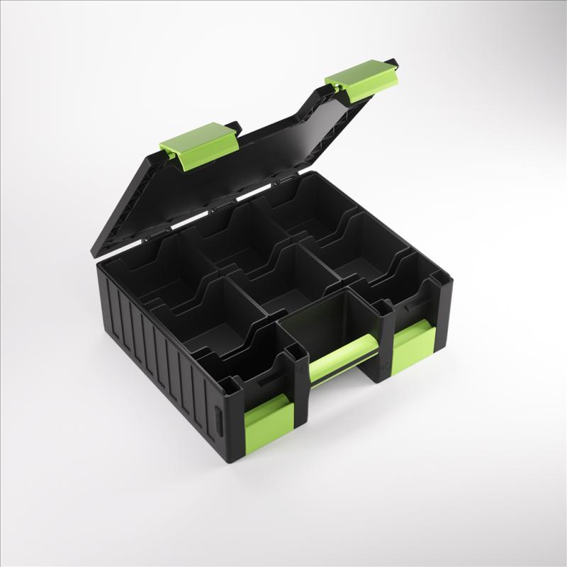 Esta caja es ideal para guardar 6 mazos Commander** (6×100 cartas en doble funda), fichas, dados, plantillas de movimiento y de alcance y muchos accesorios más. Un lado de la caja contiene 6 bandejas extraíbles para 600 cartas en doble funda con fundas interiores muy gruesas o para 800 cartas de juegos de mesa en una sola funda. El otro lado contiene 19 bandejas extraíbles en 5 tamaños diferentes, entre las que se incluyen 1 extralarga para guardar plantillas de movimiento y de alcance, 2 bandejas para cartas de tamaño americano mini y 2 para cartas de tamaño estándar. Todas estas bandejas son extraíbles y se pueden intercambiar por bandejas del modelo original Token Silo y del modelo Token Silo Cards Add-on, de manera que podrás personalizar la caja a tu antojo. Además, tiene un mecanismo de cierre innovador en clip que asegura el cierre seguro y preciso Por eso, el modelo Game Castle es la solución definitiva para quienes buscan seguridad y flexibilidad a la hora de guardar sus accesorios. ¡No te conformes con cualquier cosa!