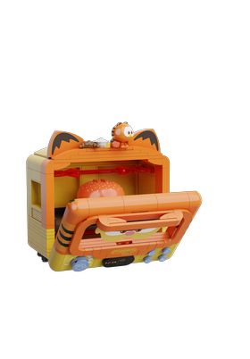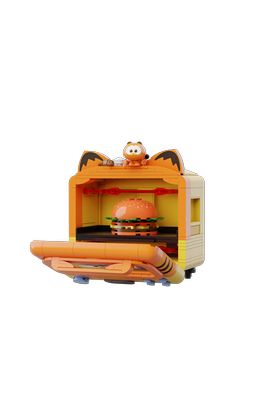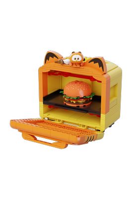Con 278 piezas y un montaje estimado de 1 hora, este set incluye una figura de un pequeño Garfield, minifiguras reposteras, una hamburguesa y una bandeja extraíble. La puerta del horno se abre completamente y muestra el simpático rostro de Garfield en la parte frontal. Además, cuenta con un panel de control detallado con botones que remata el diseño.