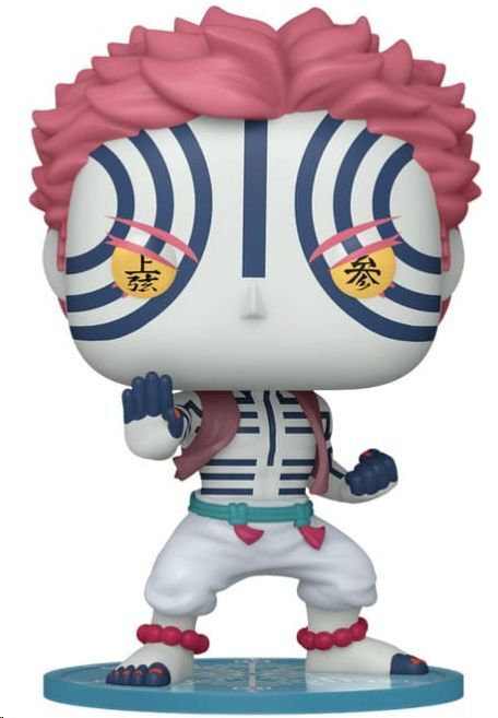 Figura Pop! Vinyl de Akaza, uno de los Doce Lunas Superiores en Guardianes de la Noche (Kimetsu no Yaiba), con una altura aproximada de 9 cm. Su diseño destaca por el cabello rosado, ojos amarillos con símbolos kanji y las icónicas marcas azules que recorren su piel.