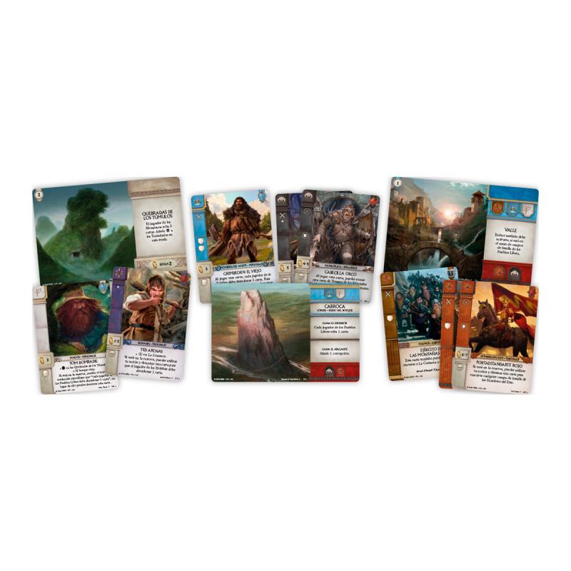 La caja de esta expansión incluye 60 cartas de facción, 9 nuevos senderos, 9 nuevos campos de batalla y 13 escaramuzas, un tipo inédito de enfrentamiento que representa poblaciones y emplazamientos menores clave en la Guerra del Anillo, como los Vados del Isen o Bree. Gracias a estos elementos, los jugadores vivirán conflictos más variados y con mayor riqueza táctica.