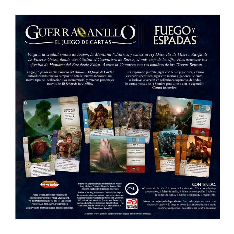 ¡Empuña tu espada, pues la Tierra Media te necesita! Fuego y Espadas expande la experiencia del juego base de Guerra del Anillo - El juego de cartas. Esta segunda gran expansión (que requiere del juego base para jugar) amplía las posibilidades estratégicas e introduce una variante que permite jugar con hasta seis personas, aumentando así la escala de la batalla por el destino del Anillo Único.