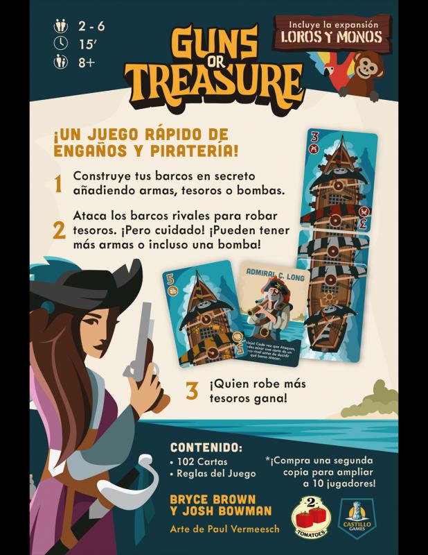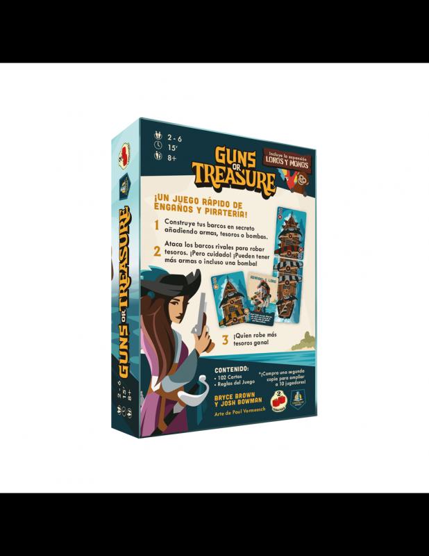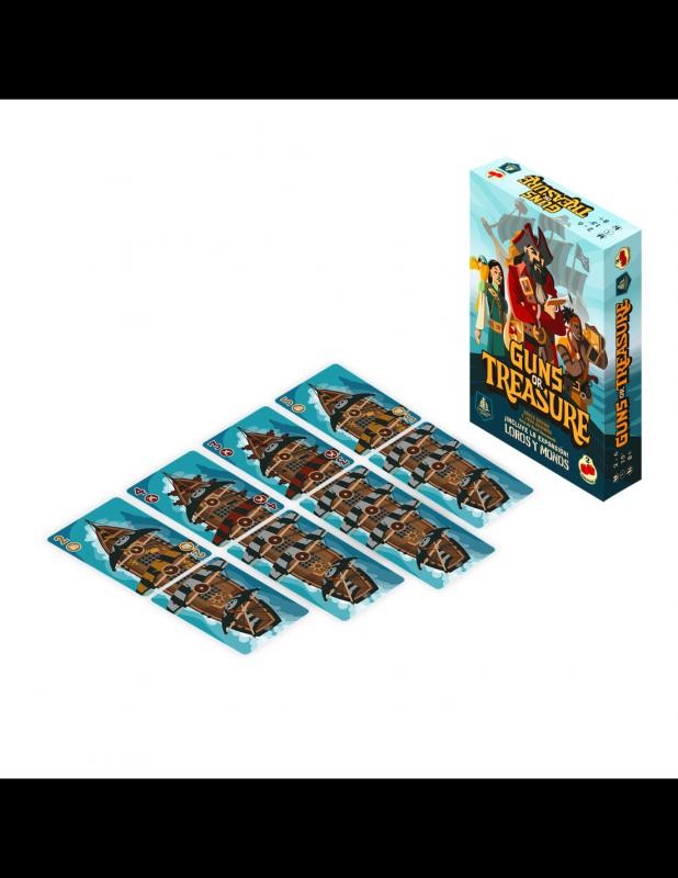 ¡Guns or Treasure es un juego rápido de piratas y faroleo! Es un juego bonito donde contruyes barcos, tiene excelente rejugabilidad y es adecuado para todo tipo de jugadores. Llévalo en el bolso para entretener a tus hijos o en el bolsillo para añadir un toque de diversión al bar con los amigos.