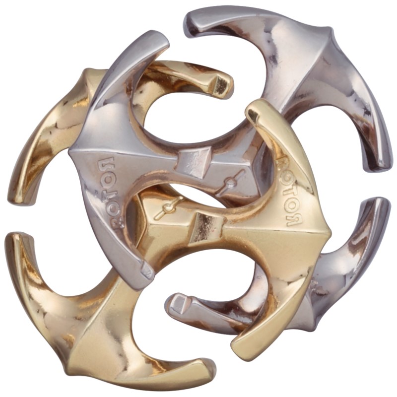 Las piezas, que tienen la misma forma y se entrelazan una en otra, presentan un elegante diseño que recuerda a un símbolo. Su particular estructura y las numerosas soluciones posibles hacen que sea un puzzle difícil.