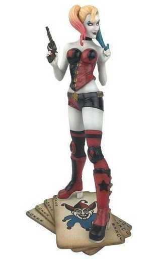 Diamond Select Toys presenta dentro de su colección DC Comic Gallery esta estatua de Harley Quinn. Esta estatua mide unos 23 cm de alto, está esculpida por Sam Greenwell y basada en los diseños del legendario artista Joseph Michael Linsner. Muestra a Harley Quinn con su nuevo traje, empuñando un revólver en una mano. Incluye una base simulando una pila de cartas para exponerla.