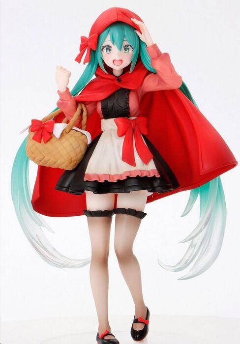 Con 18 cm de altura, esta pieza reimagina a la icónica cantante de Vocaloid con un diseño inspirado en Caperucita Roja, combinando su estilo distintivo con un toque mágico y encantador.