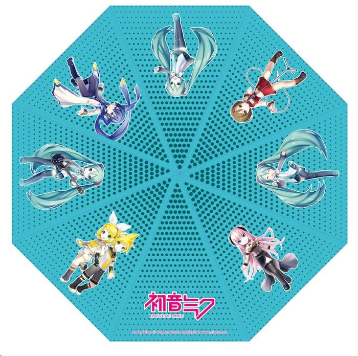 Ilumina los días de lluvia con este paraguas de Hatsune Miku, protagonizado por la icónica vocaloid en un diseño dinámico y lleno de color. Su ilustración radial reúne distintas versiones del personaje sobre un fondo turquesa vibrante, creando un efecto visual llamativo desde cualquier ángulo.
